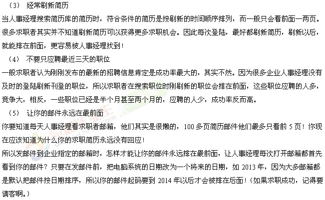 另外51job網(wǎng)站的反饋率是最低的,這也是行業(yè)秘密:因為51Job的資源80%是以報紙招聘為主,報紙招聘效率高,但網(wǎng)站上的職位都是在報紙上刊登過后作為免費與補充服務,所以很多HR只會看報紙上來的簡歷,網(wǎng)站來的簡歷基本不看,在加上51job簡歷投遞量實在太大,那些懶惰的HR才懶得一封一封的看,只會用搜索關鍵字來看,如本科+3年工作經(jīng)驗+主管等,其他不符合條件的看都不看一眼。所以你知道為什么一直沒有公司找你面試,不是你不行,而是HR都不看你發(fā)的簡歷。下面第二部分告訴你如何被他們搜索到。
