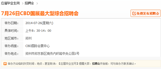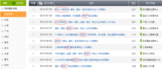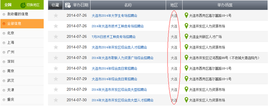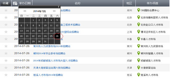 第三步:如果你希望找到某一天同時(shí)舉行的招聘會(huì)信息,你可以在舉辦日期那里選擇舉辦日期,例如選擇2014/7/26,你將可以得到26號當(dāng)天舉行的所有招聘會(huì)信息,結(jié)果如下: