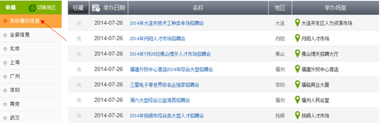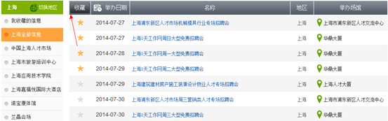 第五步:如果您想避免再次搜索自己感興趣的招聘信息帶來的麻煩,您可以在點(diǎn)擊招聘會(huì)舉辦日期前面的☆,然后在點(diǎn)擊“收藏”便可把您感興趣的信息收藏到“我收藏的信息”里面:
