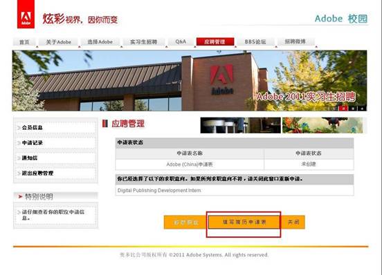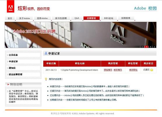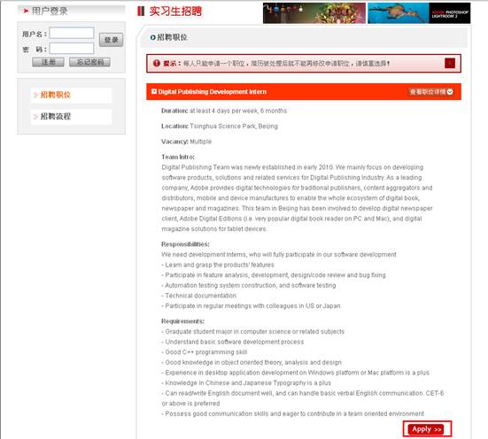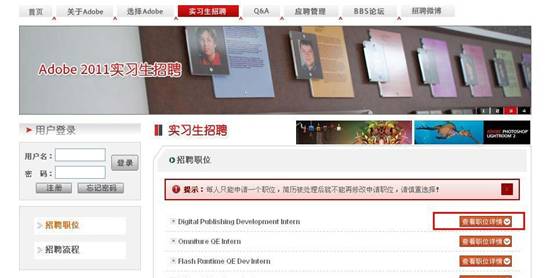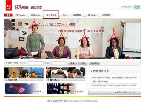 1、實(shí)習(xí)生網(wǎng)申地址:https://chinacampus.adobe.com(2012年網(wǎng)申已結(jié)束),點(diǎn)擊“實(shí)習(xí)生招聘”
