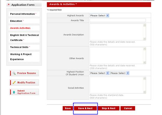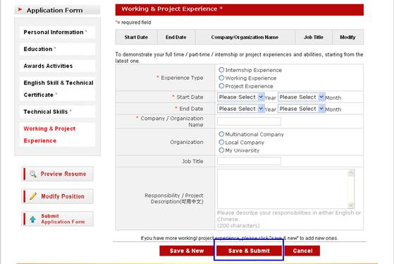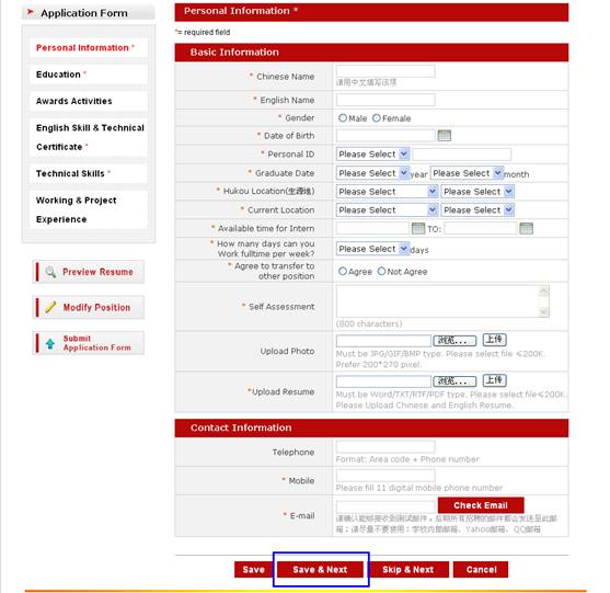在個(gè)人信息的上傳簡歷部分,上傳一個(gè)中、英文的WORD文檔簡歷最好。大家上傳了自己的簡歷后,也一定把簡歷申請(qǐng)表里對(duì)應(yīng)的各項(xiàng)填寫完整,因?yàn)楹啔v篩選主要以填寫的申請(qǐng)表格為準(zhǔn);