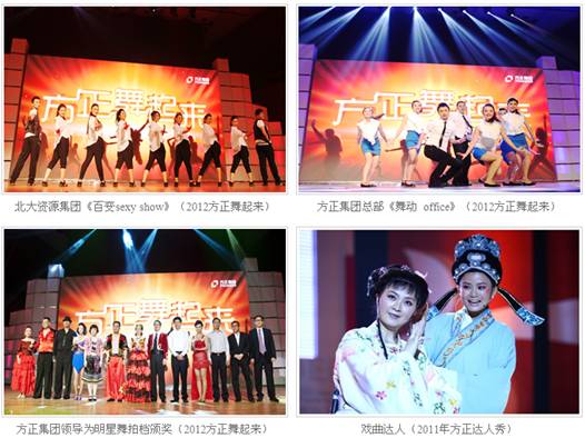 這是一組體現(xiàn)方正文化活動歷史變遷的照片,從上世紀(jì)九十年代的卡拉OK、知識競賽、辯論賽,到近幾年廣受熱捧的平民選秀、相親大會和達(dá)人秀,改變的是絢麗的舞臺和華美的妝容,不變的是真誠的表演和熱情的流露。