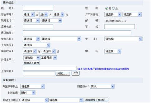 用戶在線按模板填寫個人簡歷,此外可將個人簡歷以附件形式上傳,附件支持格式為DOC、PDF或圖片 文件。