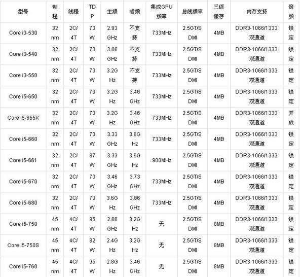 桌面級Core i系列型號列表