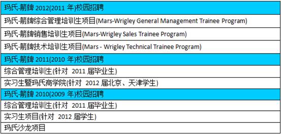 由上表信息可以看出,瑪氏每年校園招聘開(kāi)放的都是管理培訓(xùn)生職位,并在暑假期間進(jìn)行暑期實(shí)習(xí)生職位的招聘?傮w上,其招聘崗位和崗位要求相對(duì)比較穩(wěn)定。值得一提的是,2012校園招聘中,除綜合管理培訓(xùn)生外,瑪氏又增加了銷售培訓(xùn)生與技術(shù)培訓(xùn)生職位,這顯然體現(xiàn)出公司高層對(duì)兩個(gè)方向人才的重視。預(yù)計(jì)在今后的校園招聘中,這兩個(gè)職位仍將向有志于瑪氏的同學(xué)繼續(xù)開(kāi)放。