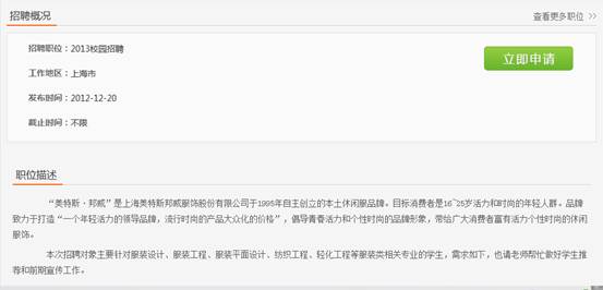 雖然美特斯邦威每年網(wǎng)申地址不同,沒有特定的網(wǎng)址。但大家可以通過以下網(wǎng)址: