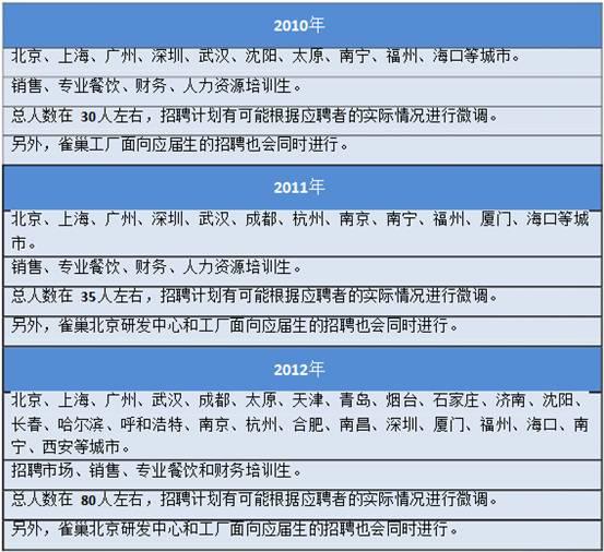 從上表可以看出,近三年雀巢招聘的人數(shù)逐年上升,并且從 2010年的北上廣、省會城市增加了一些二線城市。說明雀巢正處于發(fā)展階段,需要在中國一二線城市招募大量的人員,而且大多為培訓(xùn)生。雀巢為應(yīng)屆畢業(yè)生提供了大量的崗位,在英語溝通方面有所有要求。