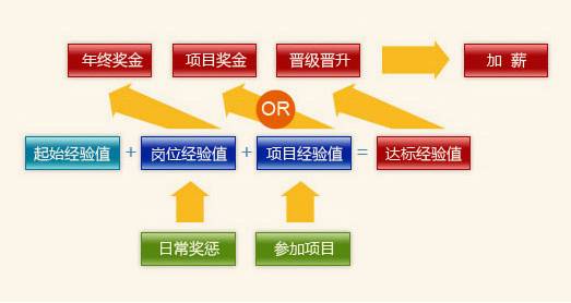 經(jīng)驗(yàn)值管理系統(tǒng)作為一套獨(dú)立的激勵(lì)系統(tǒng),是盛大游戲式管理的核心。我們通過(guò)科學(xué)的設(shè)計(jì)與評(píng)定后,全面改造員工的個(gè)人發(fā)展和回報(bào)(工資、獎(jiǎng)金、福利等)體系,讓員工自身的發(fā)展命運(yùn)牢牢掌握在自己的手中。真正實(shí)現(xiàn)加薪晉升不由領(lǐng)導(dǎo)定,成長(zhǎng)發(fā)展我做主,一切決定你升職加薪的就是經(jīng)驗(yàn)值,上不封頂,一直可以做到盛大集團(tuán)總裁!