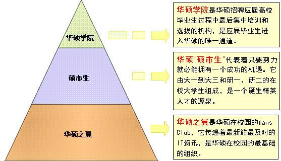 2008年,華碩校園人才招募培養(yǎng)活動步入第八個年頭。依托“華碩之翼”、華碩“碩市生”、“華碩學院”三個校園人才培養(yǎng)組織,華碩構建起完整的人才培養(yǎng)梯隊。每年,華碩的校園巡講和人才招募活動都覆蓋至全國百余所重點高校,在大學生中取得了良好的反響。華碩在校園中主動延伸人才培養(yǎng)線的模式,不僅成就了華碩源源不竭的成長原動力,同時也成為了各大跨國公司人力資源儲備創(chuàng)新的范本。