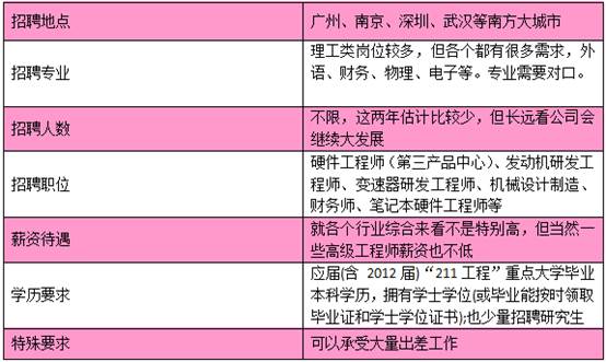 任職要求:1、2013屆統(tǒng)招應(yīng)屆畢業(yè)生; 2、需求專業(yè):機械類、交通運輸類、電子信息科學(xué)類、化學(xué)類、材料類