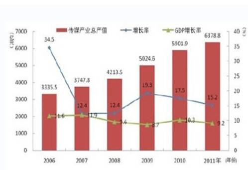 2006年-2011年我國傳媒產(chǎn)業(yè)總產(chǎn)值及增長率