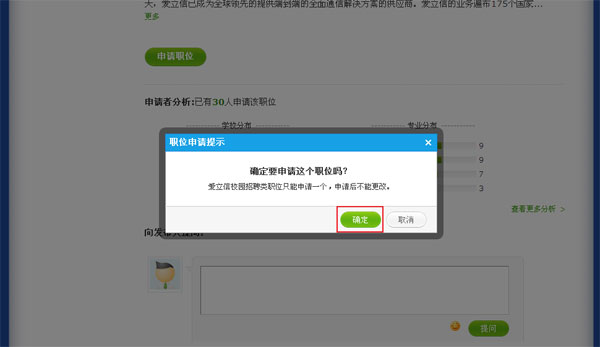 → 查看詳細(xì)職位描述并點(diǎn)擊“申請職位”按鈕,彈出確定提示,點(diǎn)擊“確定”