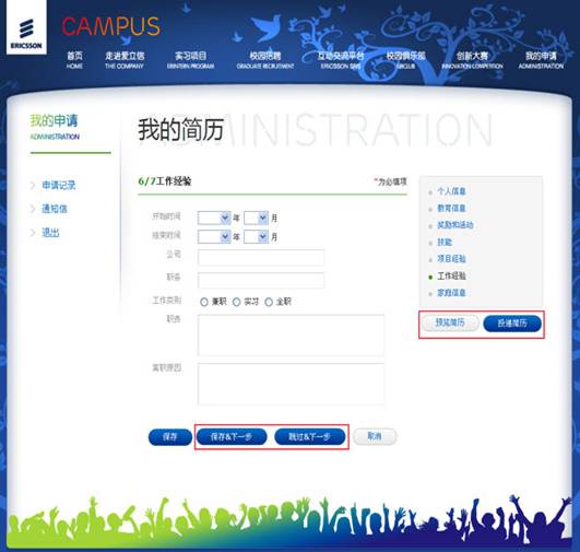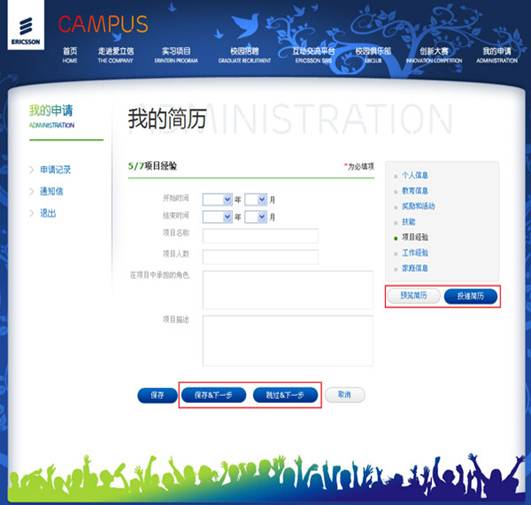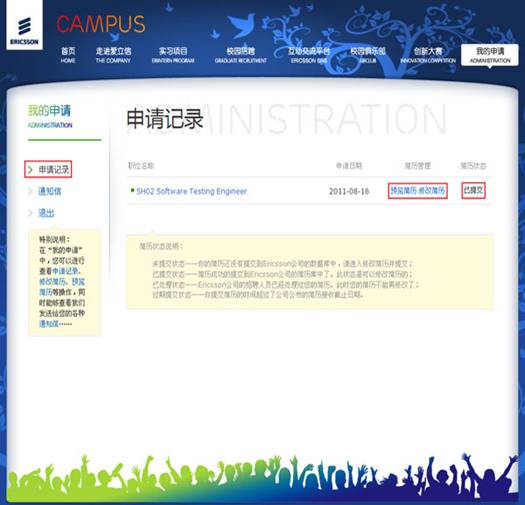 → 點(diǎn)擊頁面左側(cè)的“申請記錄”按鈕,您可以查看申請記錄,修改簡歷,預(yù)覽簡歷,同時(shí)能查看愛立信發(fā)送給您的各種通知信。