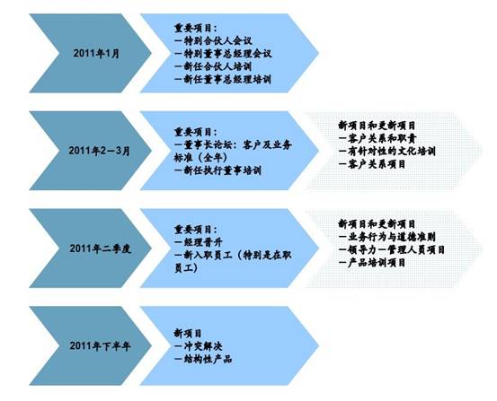 實(shí)施本報(bào)告的建議需要進(jìn)行大量培訓(xùn)。部分情況下這些培訓(xùn)是全公司范圍的項(xiàng)目,部分情況是部 門層面和針對(duì)不同業(yè)務(wù)的項(xiàng)目。全公司的培訓(xùn)項(xiàng)目應(yīng)涵蓋所有員工。對(duì)于部門層面或針對(duì)不同業(yè) 務(wù)的項(xiàng)目,也應(yīng)涵蓋大部分受眾。例如,我們預(yù)計(jì)證券部及投資管理部在全球范圍的2,100 多位專業(yè)人員將接受有關(guān)結(jié)構(gòu)性產(chǎn)品的高專業(yè)性及高強(qiáng)度培訓(xùn)。
