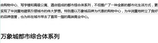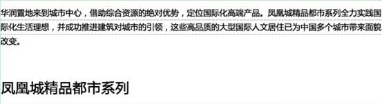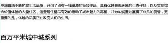 華潤(rùn)置地以“品質(zhì)給城市更多改變”為品牌理念,致力于達(dá)到行業(yè)內(nèi)客戶滿意度的領(lǐng)先水準(zhǔn),致力于在產(chǎn)品和服務(wù)上超越客戶預(yù)期,為客戶帶來(lái)生活方式的改變。目前公司已在北京、上海、深圳、成都等中國(guó)內(nèi)地39個(gè)城市踐行著高品質(zhì)的理想。并已形成八大住宅產(chǎn)品線系列:萬(wàn)象高端系列、城市高端系列、郊區(qū)高端系列、城市品質(zhì)系列、城郊品質(zhì)系列、城市改善系列、郊區(qū)改善系列、旅游度假系列;持有物業(yè)發(fā)展了都市綜合體、區(qū)域商業(yè)中心五彩城兩種模式,其中深圳萬(wàn)象城作為華潤(rùn)置地持有物業(yè)的代表作,是中國(guó)內(nèi)地最具示范效應(yīng)的都市綜合體,已在杭州、沈陽(yáng)相繼開業(yè),并將陸續(xù)在成都、青島、鄭州、上海、無(wú)錫、重慶登陸。在引領(lǐng)城市生活方式改變的同時(shí),帶動(dòng)城市經(jīng)濟(jì)的發(fā)展、改善城市面貌。華潤(rùn)置地深度挖掘品質(zhì)需求,從客戶起居行為出發(fā),提供從戶型布局、器具配置到人性化收納設(shè)計(jì)的增值服務(wù)。