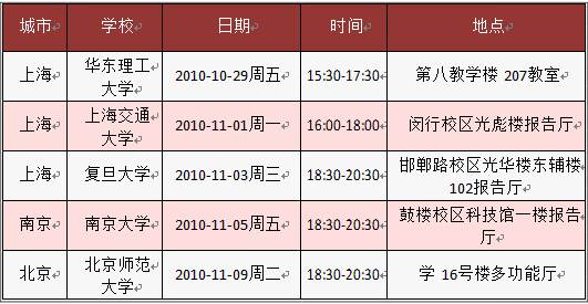 未能在簡(jiǎn)歷截止時(shí)間之前完成網(wǎng)絡(luò)申請(qǐng)的畢業(yè)生同學(xué),請(qǐng)?jiān)趯?chǎng)招聘宣講會(huì)現(xiàn)場(chǎng)投遞應(yīng)聘簡(jiǎn)歷。各地安排如下表: