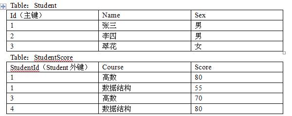 1、現(xiàn)有兩個(gè)表Student。 StudentScore,如下: