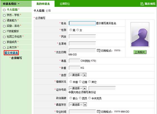 第八步:填寫完“申請表”中的相關內(nèi)容保存好并確認應聘職位無誤之后,再點擊“提交申請表”即可