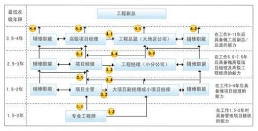 龍湖地產(chǎn)對于職能高層的任職經(jīng)驗(yàn)要求是:主修+輔修。主管的領(lǐng)域必須是主修;輔修的可以不是核心職能。龍湖為每個(gè)職能都設(shè)計(jì)了相應(yīng)的發(fā)展路徑,以工程職能為例,下圖就描述了一個(gè)工程副總可能的發(fā)展路徑和時(shí)間(演示版,以公司內(nèi)部政策為準(zhǔn)):