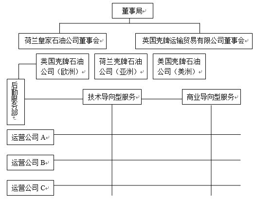 母公司皇家荷蘭石油公司和英國殼牌運輸貿(mào)易公司是股票公開上市的公司。他們本身并不是集團的成員,不參與經(jīng)營活動。皇家荷蘭石油公司擁有集團60%的股權,英國殼牌運輸貿(mào)易有限公司擁有集團40%的股權。整個集團由控股公司、服務公司和營業(yè)公司組成。兩家母公司下屬的荷蘭殼牌石油有限公司和英國殼牌石油有限公司持有服務公司的全部股權,并且直接或間接地持有集團在營業(yè)公司的所有股權。集團控股公司獲得這些股份產(chǎn)生的股息,繼而向母公司支付股息。