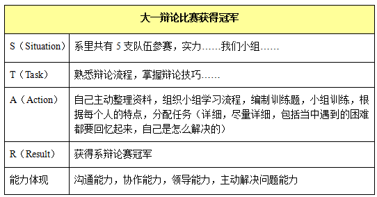 開放性問題大家都要回答吧?大家也都知道,其實每一個開放性問題都在考查自己的每一項能力,如領(lǐng)導(dǎo)能力,溝通能力,適應(yīng)能力等等。而挖掘閃光點就是在這些事件模塊中找出你所能體現(xiàn)的這些能力,如上例辯論賽中所體現(xiàn)的領(lǐng)導(dǎo)能力,溝通能力,主動解決問題。這時候,就可以在下面加多一行,能力體現(xiàn)。
