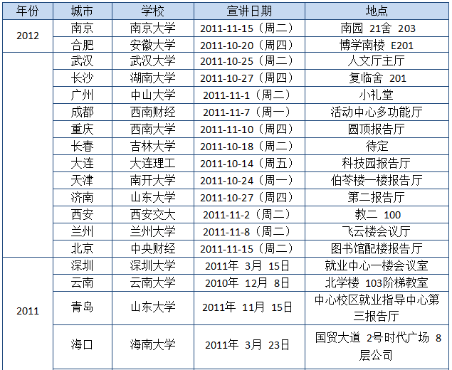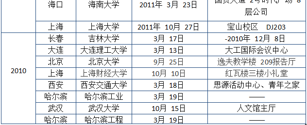 由以上圖表可以看出,泰康人壽的宣講會時間在三月或十一月份,分布地區(qū)很廣,沿海,東北,中原的一些一線城市的很不錯的大學(xué)幾乎都涉及到了,因此機會也比較大些,想要應(yīng)聘的學(xué)生要提前上網(wǎng)查找一下宣講會的時間和具體的地點,以免錯過大好的機會。