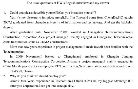 英語(yǔ)自我介紹:自己準(zhǔn)備一份英語(yǔ)的自我簡(jiǎn)歷,最好背下來(lái),當(dāng)然英語(yǔ)好的話就不用了哦。當(dāng)然也有中文的自我介紹,這些都是面試必問(wèn)的,自己心態(tài)放好就沒(méi)有好大的問(wèn)題。