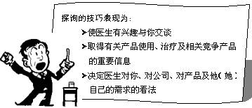 探詢可謂剝皮取核,直取需求的方法。你要想最快地發(fā)現(xiàn)醫(yī)生真正關(guān)心的焦點(diǎn)在哪兒?你如何才能達(dá)成你的目標(biāo)?你首先得學(xué)會問問題。你的問題就像探針一樣,由淺入深,由表及里,由模糊到清晰。當(dāng)船舶在大海航行突遇冰山時,當(dāng)云山霧罩里不知故里時,當(dāng)醫(yī)生顧左右而言它時,用探詢的技巧,會幫助你走出困境,發(fā)現(xiàn)機(jī)會。